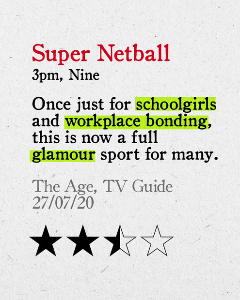 During the 2020 COVID pandemic, The Age Newspaper published a review of Super Netball in its TV guide.
